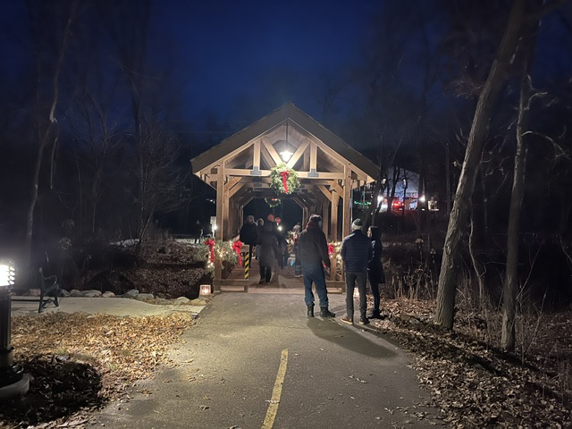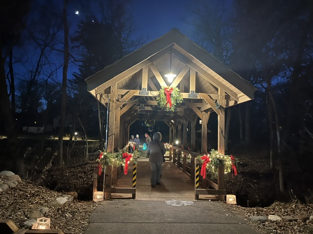 There may not have been sleigh bells for listening or snow for glistening, but more than 70 friends of the Lake Links Trail enjoyed an evening of good cheer last Friday that included a frosty (OK, cold) stroll from the Mahtomedi District Education Center to Streetcar Park to view the trail's covered bridge in all its holiday glory.